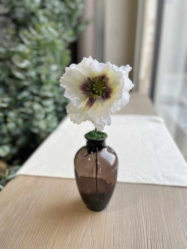 فازة زجاجية أنيقة مع زهرة شقائق النعمان ، بتفاصيلها الناعمة ولمستها الطبيعية التي تضفي على المكان جمالاً قطعة بسيطة تحمل الكثير من الأناقة، مثالية لتزيين الطاولات أو لإضفاء لمسة رقيقة على ديكور منزلك.