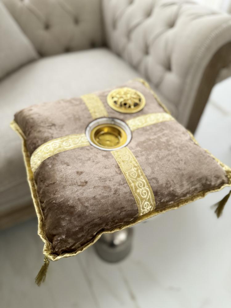 مبخرة فاخرة بتصميم أنيق، مزينة بالقماش المخملي الفاخر وتفاصيل ذهبية راقية، تضيف لمسة جمال وفخامة لأجواء الضيافة والبيت.
